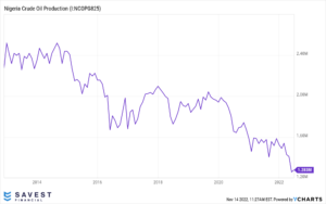 Nigerian crude oil production, its main source of foreign exchange, has nosedived in recent times. Daily crude oil production declined from over 1.8 million barrels in 2019 to less than 938 thousand barrels in September 2022 before improving to $1.014 million. As a result, the country has hardly benefited from the recent surge in oil prices. Oil theft has hamstrung the Nation’s ability to reach full production capacity.